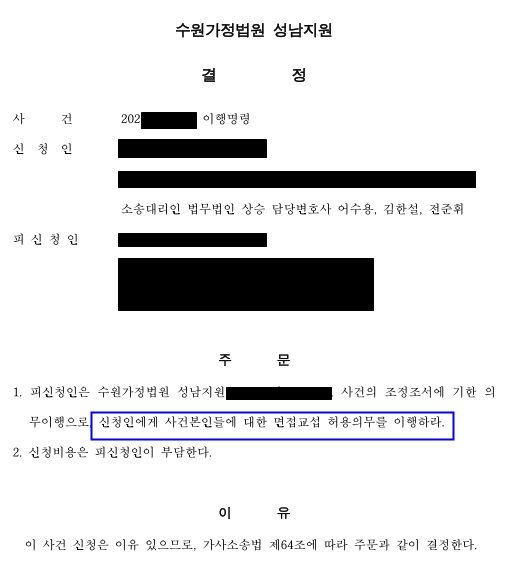 상대방이 면접교섭의무에 불응하여 이행명령을 받은 사건 - 승소